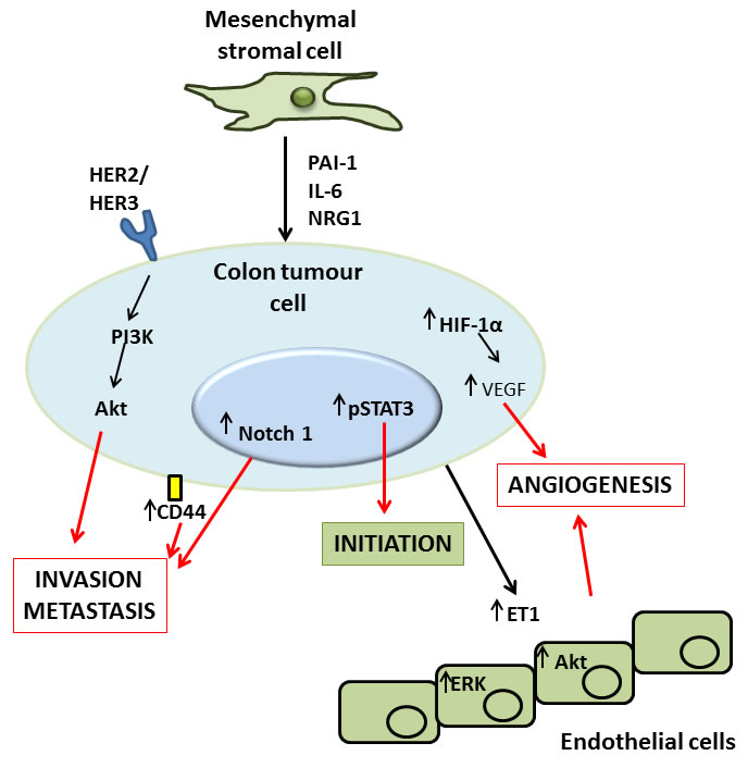 Figure 2: Molecular mechanisms of MSC mediated induction of colon tumour cell initiation, angiogenesis, invasion and metastasis. MSCs have been demonstrated to exert direct effects upon tumour cells via secretion of factors like plasminogen activator inhibitor (PAI)-1, interleukin (IL)-6 and neuregulin (NRG)1, or by activation of the human epidermal growth factor receptor (HER)2/3 receptor. The result of this signalling is activation of a number of pathways in the tumour, the net result of which is tumour promotion. Activation of HER2/3 leads to an increased invasive and metastatic capacity in the tumour via the phosphatidylinositol-4,5-bisphosphate 3-kinase (PI3K) and Akt signalling pathway. A similar effect on invasion and metastasis results from MSC-induced increases in Notch1 and CD44 signalling in colon tumour cells. Additionally, MSCs can induce phospho-signal transducer and activator of transcription (STAT)3 signalling in tumour cells which has been described as important in the initiation of tumourigenesis. Finally MSC induced increases in hypoxia-inducible factor (HIF)-1α, vascular endothelial growth factor (VEGF) and endothelin (ET)-1 can either directly, or indirectly via actions by tumour cells upon healthy endothelial cells, induce tumour angiogenesis, another important factor in increasing the growth and progression of tumours both by providing a means for the tumour to travel to distant sites, and delivering nutrients essential for the survival of the tumour.