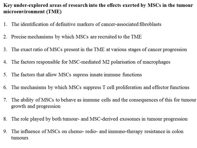 Research on the molecular pathways associated with inflammation associated CRC has identified colon epithelial cell NF-κB, STAT3 and STAT6 activation with the progression of chronic intestinal inflammation to overt CRC [58-61]. In colorectal cancer, NF-κB has been described as the “critical link” between inflammation and cancer, and also found to feature in the wound healing process [58, 62, 63]. Research focusing on the recruitment of MSCs to tumour cells has identified the importance of various signalling molecules in this process, including CXCR4, MCP-1 and VCAM-1, all of which are regulated by NF-κB [64-72]. Shi et al., found the CXCR4/SDF1 signalling axis to be of importance in MSC homing to the bone marrow in irradiated NOD/SCID mice [68]. This was confirmed by Gao et al., who identified SDF1 to be an important stimulus for MSCs to migrate towards tumour conditioned medium [69]. Other important factors implicated in this process are MCP-1, the blockade of which significantly reduced the migration of MSCs to breast tumour xenografts in mice, and VCAM-1 which has been shown to enhance MSC migration to glioma cells in vitro [70, 71]. With regards specifically to the setting of colorectal cancer, a study by Uchibori et al., in 2013 confirmed an important role for VCAM-1 in the process of migration [72]. In addition to this important role for tumour cell NF-κB, recent research has shown that stromal cell NF-κB is also has a part to play in colorectal tumourigenesis, when a decreased tumour incidence was identified following intestinal stromal cell specific deletion of IKKβ [37]. In the context of inflammation associated cancer and spontaneous CRC, it is likely that there are multiple mechanisms involved in MSC recruitment to the TME. It is well established that MSCs are recruited to the tumour microenvironment and once there, act to alter tumour biology. In depth knowledge of how tumours regulate the process of MSC recruitment and how MSC migration is affected by inflammation in the tumour microenvironment is needed. More specifically, identification of tumour specific mechanisms that regulate MSC migration, and an understanding of how these mechanisms can be targeted is essential.