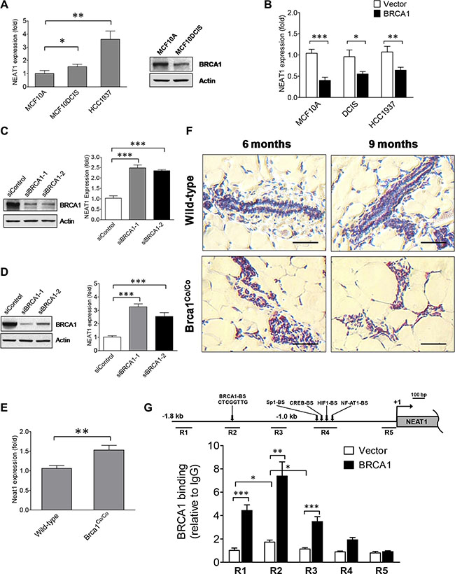 Figure 1: BRCA1 functions as an upstream regulator to inhibit the expression of the NEAT1 gene. (A) Expression analysis of NEAT1 in MCF10A, MCF10DCIS and HCC1937 cells. qRT-PCR results are shown in the left panel. Western blot analysis of BRCA1 protein levels in MCF10A and MCF10DCIS cells is shown in the right panel. β-Actin protein levels were used as a protein loading control. (B) BRCA1 overexpression downregulates NEAT1 expression. qRT-PCR analysis of NEAT1 expression was performed on MCF10A, MCF10DCIS and HCC1937 cells transfected with the empty vector or BRCA1 expression plasmid DNA. (C, D) BRCA1 knockdown leads to induction of NEAT1 expression. Western blot analysis of BRCA1 and β-Actin (left panels) and qRT-PCR analysis of NEAT1 expression (right panels) were performed on MCF10A (C) and MCF7 (D) cells transfected with either the control or BRCA1 siRNA. Two different BRCA1 siRNAs (siBRCA1-1 and siBRCA1-2) were used in the knockdown experiment. (E) Expression analysis of Neat1 RNA levels in wild-type and Brca1-deficient mammary glands. qRT-PCR analysis of Neat1 expression was performed on mammary glands from wild-type and Brca1-deficient (Brca1Co/Co) mice. (F) Brca1 deficiency gives rise to elevated Neat1 RNA levels in ductal epithelial cells of mammary glands. In situ hybridization (ISH) analysis of Neat1 RNA expression was performed on mammary gland tissue sections from wild-type and Brca1Co/Co mice. The scale bar indicates 50 μm. (G) BRCA1 protein binds its cognate binding site in vivo located in the upstream genomic region of the human NEAT1 gene. ChIP assays using the BRCA1 antibody or the mouse IgG control were performed on MCF10A cells transfected with the control empty vector or BRCA1 expression plasmid DNA. qPCR assays were performed on ChIP samples to quantitate five distinct immunoprecipitated genomic DNA regions (R1 to R5 as indicated in the map) upstream of the NEAT1 gene by using five different pairs of primers. The genomic map for the 5′-end of the NEAT1 gene and its upstream DNA region is shown in the top panel. The putative transcription factor binding sites are depicted in the map. The result of quantitative ChIP analysis is presented as a bar graph shown in the bottom panel. Ectopically expressed BRCA1 protein predominantly bound to the R2 region. An approximately two-fold increase in the binding to the R2 region in the empty-vector-transfected cell sample was derived from the binding of endogenous BRCA1 protein. For all of bar graphs presented here, the error bar represents the standard deviation (SD) of the dataset (n = 3). *p < 0.05, **p < 0.01, ***p < 0.001.
