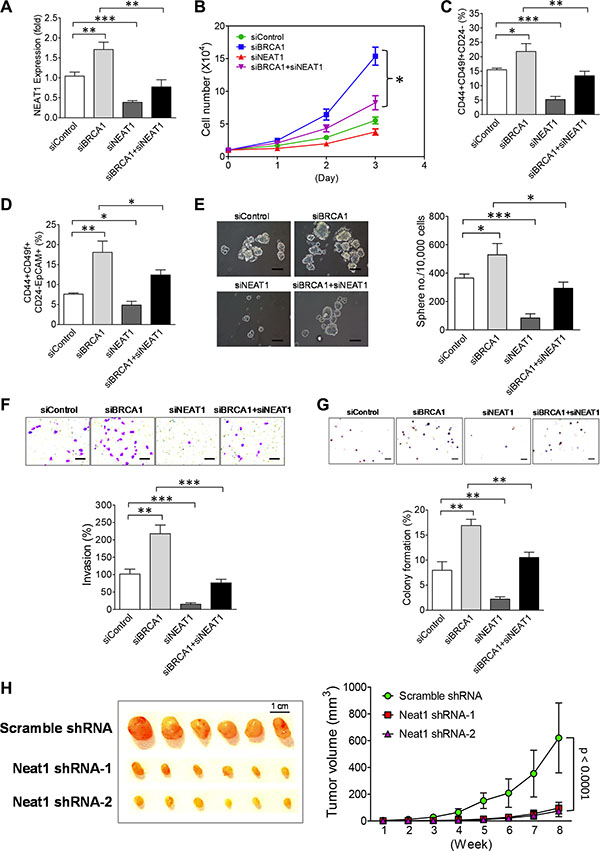 Figure 3: NEAT1 upregulation induced by BRCA1 deficiency promotes in vitro malignancies and in vivo tumorigenicity of breast tumor cells. (A) NEAT1 siRNA abolishes the upregulation of NEAT1 by BRCA1 knockdown. qRT-PCR analysis of NEAT1 expression was performed on MCF10DCIS cells transfected with the control siRNA (siControl), the siRNA targeting BRCA1 (siBRCA1-1) or NEAT1 (siNEAT1-2), or the siRNA combination targeting both genes for 48 hours. (B) Co-knockdown of NEAT1 partially abolishes the enhanced proliferation of BRCA1-knockdown MCF10DCIS cells. At 24 hrs after transfection, 10,000 siRNA-transfected MCF10DCIS cells shown in (A) were seeded for cell proliferation assays. Live cell counting was performed by trypan blue dye exclusion assays. (C) Co-knockdown of NEAT1 attenuates the expansion of BCSCs in BRCA1-knockdown MCF10DCIS cells. Flow cytometry analysis of surface antigen markers CD44, CD49f and CD24 for BCSC identification was performed on siRNA-transfected MCF10DCIS cells shown in (A). The 2D dot plots that profile CD44+CD49f+ and CD44+CD49f+CD24– cell subsets are shown in Supplementary Figure S7A. The percentages of BCSC-enriched CD44+CD49f+CD24– cell subsets from three independent flow cytometry experiments were used to make the bar graph. Error bars indicate standard deviation (SD). (D) BRCA1 knockdown significantly expands the EpCAM+BCSC population and co-knockdown of NEAT1 attenuates its expansion. Flow cytometry analysis of BCSC-related protein antigens CD44, CD49f, CD24 and EpCAM was performed on siRNA-transfected MCF10DCIS cells shown in (A). The gated CD44+CD49f+ cell subsets shown in Supplementary Figure S7A were subjected to the 2D dot plot analyses that profile CD24 and EpCAM as shown in Supplementary Figure S7B. The percentages of EpCAM+BCSC cell subsets (CD44+CD49f+CD24–EpCAM+) in siRNA-transfected MCF10DCIS cells from three independent flow cytometry experiments were used to make the bar graph. (E) Co-knockdown of NEAT1 impairs BRCA1-knockdown-induced increases in the size and formation efficiency of BCSC spheres developed from MCF10DCIS cells. At 48 hrs after transfection, siRNA-transfected MCF10DCIS cells shown in (A) were seeded in six-well plates for stem-cell sphere formation assays. Pictures of formed BCSC spheres are shown in the left panel and the bar graph of sphere formation efficiency data is shown in the right panel. The scale bar indicates 100 μm. (F) NEAT1 knockdown abolishes a BRCA1-deficiency-induced increase in invasiveness of MCF10DCIS tumor cells. 48 hours posttransfection, siRNA-transfected MCF10DCIS cells shown in (A) were subjected to invasion assays. The stained pictures are shown in the top panel and the quantitative bar graph of invasion data is shown in the bottom panel. The scale bar indicates 100 μm. (G) Co-knockdown of NEAT1 attenuates the increased anchorage-independent growth of MCF10DCIS tumor cells induced by BRCA1 knockdown. 48 hours posttransfection, soft agar assays were performed on siRNA-transfected MCF10DCIS cells shown in (A). The stained pictures are shown in the top panel and the quantitative bar graph of colony formation efficiency data is shown in the bottom panel. The scale bar indicates 200 μm. (H) Neat1 knockdown inhibits the in vivo development of Brca1-deficient xenograft mammary tumors. 1 × 106 stable scramble shRNA-expressing or shNeat1-expressing tumor cells that were derived from Brca1-deficient mammary tumors developed in MMTV-cre;Brca1co/co mice were injected into the fourth mammary fat pad of syngeneic female mice. The development of xenograft tumors was monitored for eight weeks and tumor size was measured weekly. Tumor growth curves (n = 6) were plotted and are shown in the right panel. The dissected tumors were photographed and are shown in the left panel. The knockdown efficiency of these two Neat1 shRNAs (shNeat1-1 and shNeat1-2) is shown in Supplementary Figure S6A. The error bar shown in all bar graphs and the growth rate plot represents the SD of the dataset (n = 3). *p < 0.05, **p < 0.01, ***p < 0.001.