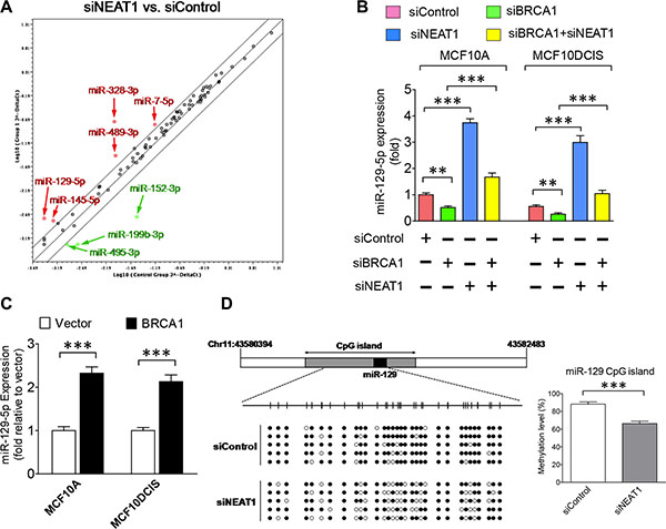 Figure 4: Epigenetic regulation of miR-129-5p expression by the BRCA1/NEAT1 axis. (A) Expression profiling of miRNAs in MCF10A cells with NEAT1 knockdown by PCR array assays. The common logarithms of miRNA expression values from control siRNA-transfected cells were plotted against those from NEAT1 siRNA (siNEAT1-2)-transfected cells to make the scatter plot. miRNAs that were upregulated and downregulated at least 2-fold in NEAT1-knockdown MCF10A cells are indicated by the red and green colors, respectively. These identified NEAT1-regulated miRNAs were confirmed by another NEAT1 siRNA (siNEAT1-1) (data not shown). (B) Downregulation of miR-129-5p expression by BRCA1 knockdown is abolished by co-knockdown of NEAT1. qRT-PCR analysis of miR-129-5p expression was performed on MCF10A and MCF10DCIS cells transfected with the control siRNA, the siRNA targeting BRCA1 or NEAT1, or the siRNA combination targeting both genes for 48 hours. (C) Ectopic expression of BRCA1 upregulates miR- 129- 5p expression. qRT-PCR analysis of miR-129-5p expression was performed on MCF10A and MCF10DCIS cells transfected with the empty vector or BRCA1 expression plasmid DNA. (D) NEAT1 knockdown leads to partial demethylation of the CpG island in the miR-129 gene. Bisulfite sequencing analysis of the DNA region (containing 32 CpG dinucleotides) within the CpG island of the miR-129 gene was performed on genomic DNA samples isolated from control and NEAT1 siRNA-transfected MCF10DCIS cells. Filled and unfilled circles represent methylated and unmethylated CpG dinucleotides, respectively. The methylation level bar graph with error bars was plotted based on sequencing results from five randomly selected clones for each sample. The error bar shown in sub-figures (B, C) represents the SD of the dataset (n = 3). **p < 0.01, ***p < 0.001.