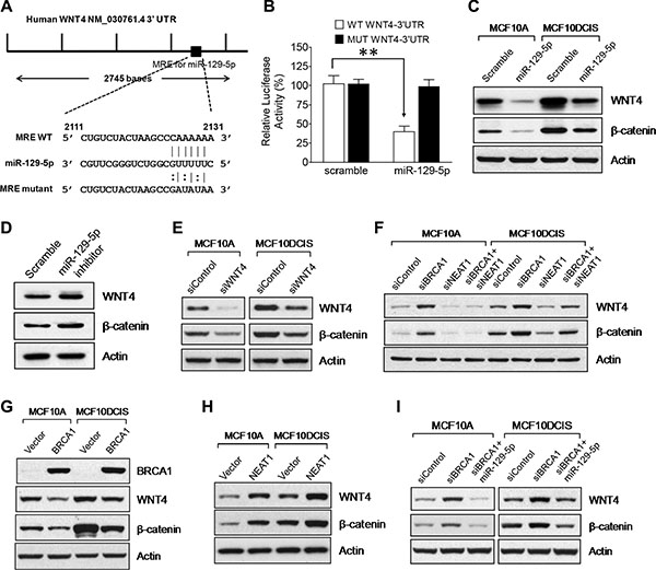 Figure 6: WNT4 is a miR-129-5p target gene that is regulated by the BRCA1/NEAT1/miR-129-5p axis. (A) A map for the predicted miR-129-5p targeting site in the 3′-untranslated region of the WNT4 mRNA. A DNA fragment with mutations in the seeding site of WNT4 3′-UTR was used to construct the mutant reporter and its RNA sequence is shown under the map with its wild-type and miR-129- 5p sequences. (B) The miR-129-5p mimic inhibits the luciferase expression of the wild-type, but not the mutated WNT4 3′- UTR reporter. HEK-293T cells were transfected with the wild-type or mutated WNT4 3′-UTR reporter plasmid DNA along with either the control scramble dsRNA or the miR-129-5p mimic. All cell samples were also co-transfected with Renilla plasmid DNA, which was used as a transfection efficiency control. Dual Luciferase assays were performed on transfected cells 24 hrs posttransfection. The measured Luciferase activity values were normalized by Renilla activity values. The error bar represents the SD of the dataset (n = 3). **p < 0.01. (C) The miR-129-5p mimic downregulates WNT4 expression and WNT signaling activity. Western blot analysis of WNT4, β-catenin and β-actin was performed on scramble dsRNA-tansfected and miR-129-5p-transfected MCF10A and MCF10DCIS cells. (D) Inhibition of miR-129-5p in MCF10A cells leads to WNT4 upregulation and activation of WNT signaling. 48 hours posttransfection, Western blot analysis of WNT4, β-catenin and β-actin was performed on MCF10A cells transfected with either the scramble or miR-129-5p inhibitor RNA. (E) WNT4 is functionally required for endogenous WNT signaling activity. Western blot analysis of WNT4, β-catenin and β-actin was performed on MCF10A and MCF10DCIS cells transfected with the control siRNA or the WNT4 siRNA for 48 hrs. (F) Upregulation of WNT4 expression and activation of WNT signaling by BRCA1 knockdown are NEAT1-dependent. Western blot analysis of WNT4, β-catenin and β-actin was performed on MCF10A and MCF10DCIS cells transfected with the control siRNA, the siRNA targeting BRCA1 or NEAT1, or the siRNA combination targeting both genes for 48 hours. (G) Ectopic expression of BRCA1 downregulates WNT4 expression and suppresses WNT signaling activity. Western blot analysis of BRCA1, WNT4, β-catenin and β-actin was performed on MCF10A and MCF10DCIS cells transfected with the empty vector or BRCA1 expression plasmid DNA. (H) Ectopic expression of NEAT1 upregulates WNT4 expression and activates WNT signaling activity. Western blot analysis of WNT4, β-catenin and β-actin was performed on MCF10A and MCF10DCIS cells transfected with the empty vector or NEAT1 expression plasmid DNA. (I) Upregulation of WNT4 expression and activation of WNT signaling by BRCA1 knockdown are abolished by the miR-129-5p mimic. Western blot analysis of WNT4, β-catenin and β-actin was performed on MCF10A and MCF10DCIS cells transfected with the control siRNA, the BRCA1 siRNA or BRCA1 siRNA plus miR-129-5p mimic for 48 hours. β-actin was used as a protein loading control for all Western blot analyses shown here.