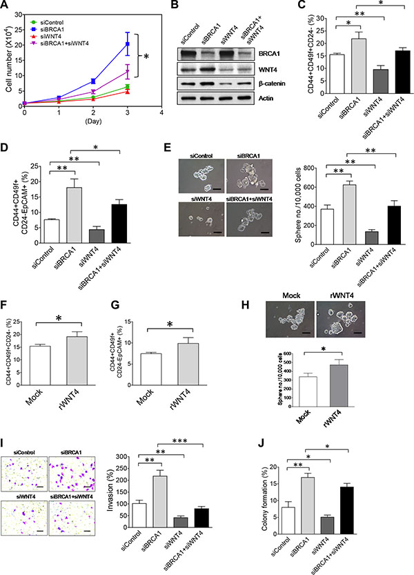 To unveil the functional role of WNT4 in BCSCs, we performed flow cytometry analysis of BCSCs in MCF10DCIS cells with single and double knockdown of WNT4 and BRCA1. Knockdown of WNT4 in MCF10DCIS cells caused a significant reduction in both CD44+CD49f+CD24– (9.55 ± 1.59% vs. 15.51 ± 0.55% of the control, p < 0.01; n = 3) and CD44+CD49f+CD24–EpCAM+ BCSC subsets (4.39 ± 1.03% vs. 7.62 ± 0.28% of the control, p < 0.01; n = 3) (Figure 7C, 7D). In the co-knockdown experiment, WNT4 knockdown suppressed over 50% of the increase in the CD44+CD49f+CD24– (from 21.85 ± 2.71% down to 17.06 ± 1.22% relative to 15.51 ± 0.55% of the control, p < 0.05; n = 3) and CD44+CD49f+CD24–EpCAM+ (18.07 ± 2.83% down to 12.59 ± 1.56% relative to 7.62 ± 0.28% of the control, p < 0.05; n = 3) BCSC subsets induced by BRCA1 knockdown (Figure 7C, 7D). Consistent with flow cytometry results, stem-cell sphere formation studies indicate that WNT4 is intrinsically required for self-renewal of BCSCs, and also for the increased stemness caused by BRCA1 deficiency (Figure 7E).