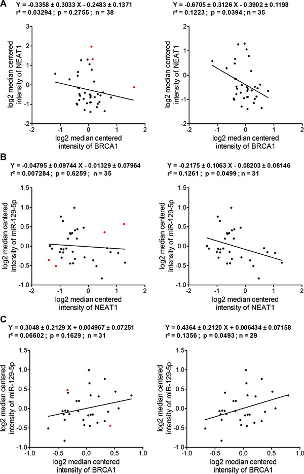 Figure 8: In silico expression correlation analysis of BRCA1, NEAT1 and miR-129-5p in a cohort of human breast cancer cell lines. (A) Regression analysis of the expression correlation between BRCA1 and NEAT1 in breast cancer cell lines. The left regression analysis plot was made according to BRCA1 and NEAT1 expression datasets from 38 BC lines. The right regression analysis plot was made according to the datasets of 35 BC lines after the data of three cell lines (SUM-190PT, SUM-225CWN, and T47D; indicated by red dots shown in the left plot) with a poor correlation were excluded from analysis. (B) Regression analysis of the expression correlation between NEAT1 and miR-129-5p in breast cancer cell lines. The left regression analysis plot was made according to NEAT1 and miR- 129-5p expression datasets from 35 BC lines that were narrowed down from analysis shown in the right panel of (A). The right regression analysis plot was made according to the datasets of 31 BC lines after the data of four cell lines (HCC70, MDA-MB-231, SUM-185PE, and SUM-52PE; indicated by red dots shown in the left plot) with a poor correlation were excluded from analysis. (C) Regression analysis of the expression correlation between BRCA1 and miR-129-5p in breast cancer cell lines. The left regression analysis plot was made according to BRCA1 and miR-129-5p expression datasets from 31 BC lines that were narrowed down from analysis shown in the right panel of (B). The right regression analysis plot was made according to the datasets of 29 BC lines after the data of two cell lines (BT- 483 and HCC1143; indicated by red dots shown in the left plot) with a poor correlation were excluded from analysis. All of expression correlation analyses shown here were based on expression data values of Supplementary Table S1.