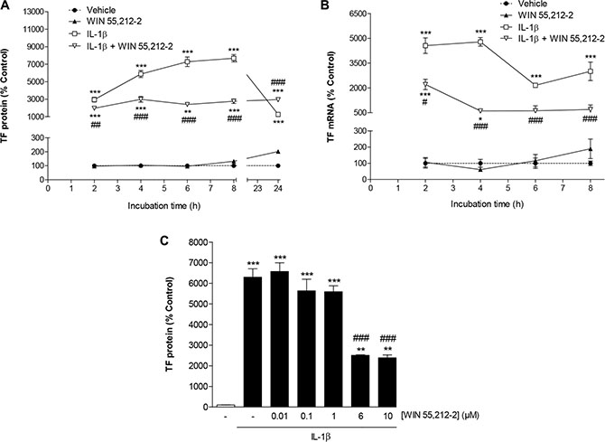 Time course and concentration dependence of the inhibitory effect of WIN 55,212-2 on IL-1β-induced TF expression