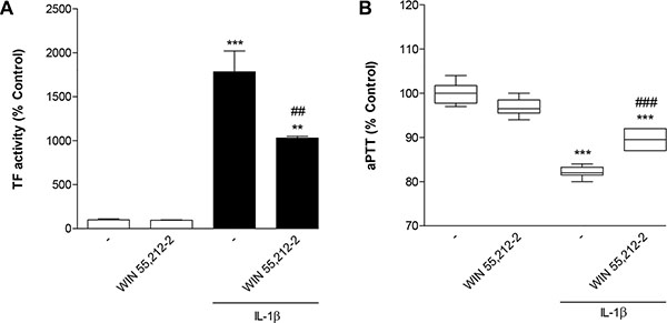 Figure 2: Impact of WIN 55,212-2 on IL-1β-induced TF activity (A) and IL-1β-mediated decrease of aPTT (B). HUVEC were incubated with WIN 55,212-2 at 10 μM for 8 h in the presence or absence of IL-1β (10 ng/ml). Percent control represents comparison with vehicle-treated cells (100%) in the absence of test substance. Values (A) are means + SEM of n = 3 per group. In the box plot (B, n = 6 per group), boxes extend from the 25th percentile to the 75th percentile, with a horizontal line inside the box at the median. Whiskers indicate minimum and maximum values, respectively. **P < 0.01, ***P < 0.001 vs. vehicle control; ##P < 0.01, ###P < 0.001 vs. IL-1β-treated cells, ANOVA plus post hoc Bonferroni test.