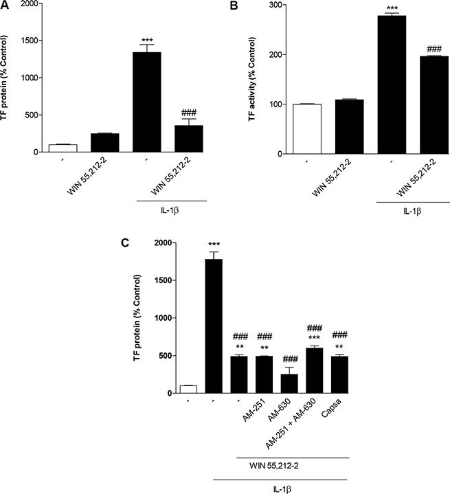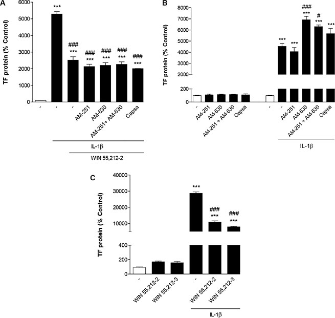 Figure 3: Involvement of cannabinoid-activated receptors in inhibition of IL-1β-induced TF protein expression by WIN 55,212-2. Effect of AM-251 (CB1 antagonist), AM-630 (CB2 antagonist) and capsazepine (Capsa, TRPV1 antagonist) on the WIN 55,212-2-mediated inhibition of IL-1β-induced TF protein expression (A) or basal and IL-1β-induced TF protein levels (B). Cells were pretreated with the respective receptor antagonist (all tested at a final concentration of 1 μM) for 1 h. IL-1β (10 ng/ml), WIN 55,212 2 (10 μM) or vehicle were added subsequently and the incubation was continued for 8 h. (C) Effect of the cannabinoid receptor-inactive enantiomer WIN 55,212-3 on basal and IL-1β-induced TF protein expression. Cells were incubated with equimolar concentrations of WIN 55,212-3 and WIN 55,212-2 (both at 10 μM) for 8 h. Percent control represents comparison with vehicle-treated cells (100%) in the absence of test substance. Values are means + SEM of n = 3 per group. ***P < 0.001 vs. corresponding vehicle control; #P < 0.05, ###P < 0.001 vs. IL-1β, ANOVA plus post hoc Bonferroni test.