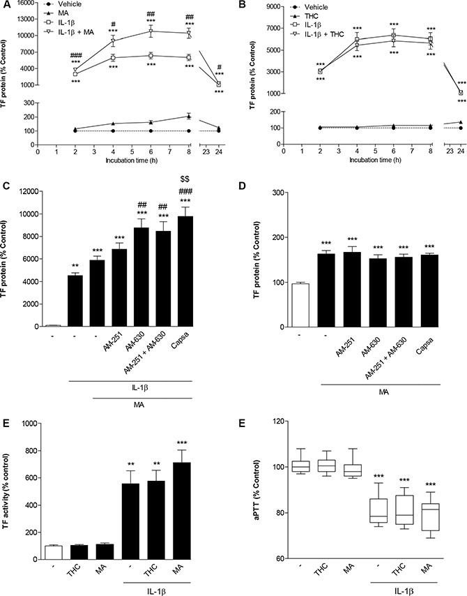 Figure 4: Impact of R(+)-methanandamide (MA) and Δ9-tetrahydrocannabinol (THC) on basal and IL-1β-induced TF expression. Time dependencies of TF protein expression following incubation of cells with MA (A) or THC (B) in the presence or absence of IL-1β. Effect of AM-251 (CB1 antagonist), AM-630 (CB2 antagonist) and capsazepine (Capsa, TRPV1 antagonist) on the MA-mediated increase of IL-1β-induced (C) or basal TF protein levels (D). Impact of MA and THC on IL-1β-induced TF activity (E) and on IL-1β-mediated decrease of aPTT (F). Cells were incubated with MA at 10 μM or THC at 3 μM for the indicated times (A, B) or for 8 h (C–F) in the presence or absence of IL-1β (10 ng/ml). Receptor antagonists (C, D) were added to cultures 1 h prior to MA. Percent control represents comparison with vehicle-treated cells (100%) in the absence of test substance. Values are means + SEM of n = 3 (A, B, C, E) or n = 6 (D) per group. In the box plot (F, n = 17–18 per group), boxes extend from the 25th percentile to the 75th percentile, with a horizontal line inside the box at the median. Whiskers indicate minimum and maximum values, respectively. **P < 0.01, ***P < 0.001 vs. corresponding vehicle control; #P < 0.05, ##P < 0.01, ###P < 0.001 vs. IL-1β, §§P < 0.01 vs. IL-1β + MA, ANOVA plus post Bonferroni test.