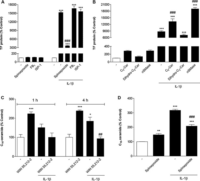 Figure 5: Role of ceramide in IL-1β-induced TF expression and its modulation by WIN 55,212-2. (A) Effect of nSMase spiroepoxide inhibitor (selective inhibitor of nSMase; 10 μM), fumonisin B1 (selective inhibitor of ceramide synthase; 50 μM) and ISP-1 (serine palmitoyltransferase inhibitor; 10 μM) on basal and IL-1β-induced TF protein levels. Cells were pretreated with the respective inhibitor for 1 h (fumonisin B1, ISP) or 1.5 h (nSMase spiroepoxide inhibitor). IL-1β or vehicle were added subsequently and the incubation was continued for 8 h. (B) Effect of C2-ceramide (10 μM), dihydro-C2-ceramide (10 μM) and nSMase from B. cereus (10 mU/ml) on basal and IL-1β-induced TF protein levels. Cells were incubated with the respective substance in the presence or absence of IL-1β for 8 h. (C, D) Impact of WIN 55,212-2 (C, 10 μM) and nSMase spiroepoxide inhibitor (D, 10 μM) on basal and IL-1β-induced cellular concentrations of C16-ceramide. Cells were treated with IL-1β, WIN 55,212-2 or vehicle for the times indicated (C). In case of (D) cells were pretreated with nSMase spiroepoxide inhibitor for 1.5 h. IL-1β or vehicle were added subsequently and the incubation was continued for 4 h. Percent control represents comparison with vehicle-treated cells (100%) in the absence of test substance. Values are means + SEM of n = 3 per group. *P < 0.05, **P < 0.01, ***P < 0.001 vs. corresponding vehicle control; ##P < 0.01, ###P < 0.001 vs. IL-1β, ANOVA plus post hoc Bonferroni test.