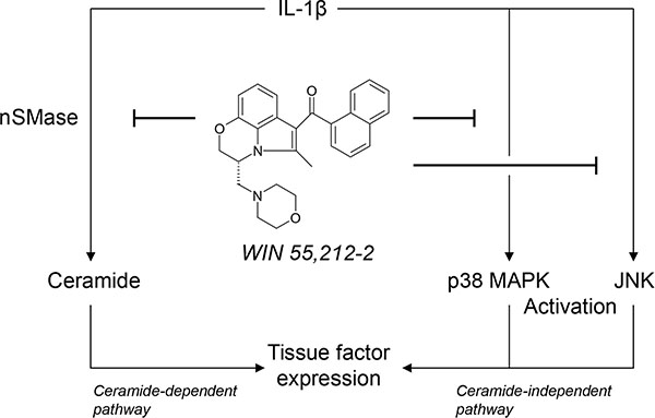 Although cannabinoids have emerged as potential therapeutic agents in diverse medical fields, their impact on hemostasis and thrombosis still remains controversial. The present study demonstrates the synthetic cannabinoid WIN 55,212-2 to decrease endothelial expression and activity of TF, a pivotal initial factor in blood coagulation and thrombus propagation. The mechanism elicited by WIN 55,212-2 was shown to include an interference with IL-1β-induced ceramide formation and activation of p38 MAPK and JNK (Figure 9).