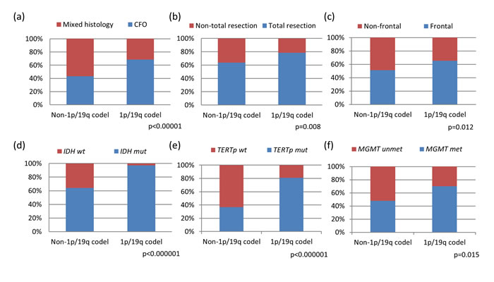 Chromosomal 1p and 19q status were examined in all 337 samples of oligodendroglial tumors, with 1p loss detected in 63.8% (215/337) and 19q loss detected in 62.0% (209/337) of the cohort. Combined 1p/19q codeletion was observed in 60.2% (203/337) of cases including 95 oligodendrogliomas, 44 anaplastic oligodendrogliomas, 51 oligoastrocytomas and 13 anaplastic oligoastrocytomas. 1p loss only and 19q loss only were found in 8.2% and 4.5% among the 134 1p/19q non-codeleted oligodendroglial tumors, respectively. Clinical and molecular characteristics were summarized according to 1p/19q codeletion status in Table 1. Comparing the variables between 1p/19q codeleted and non-codeleted oligodendroglial tumors, tumors with codeletion showed significant associations with classic oligodendroglial histology (p < 0.00001), frontal lobe localization (p = 0.012), and were more amenable to total surgical resection (p = 0.008). Molecularly, 1p/19q codeleted tumors also exhibited co-occurring associations with IDH mutation (p < 0.000001), TERTp mutation (p < 0.000001), and MGMT promoter methylation (p = 0.015) (Figure 1a to 1f).