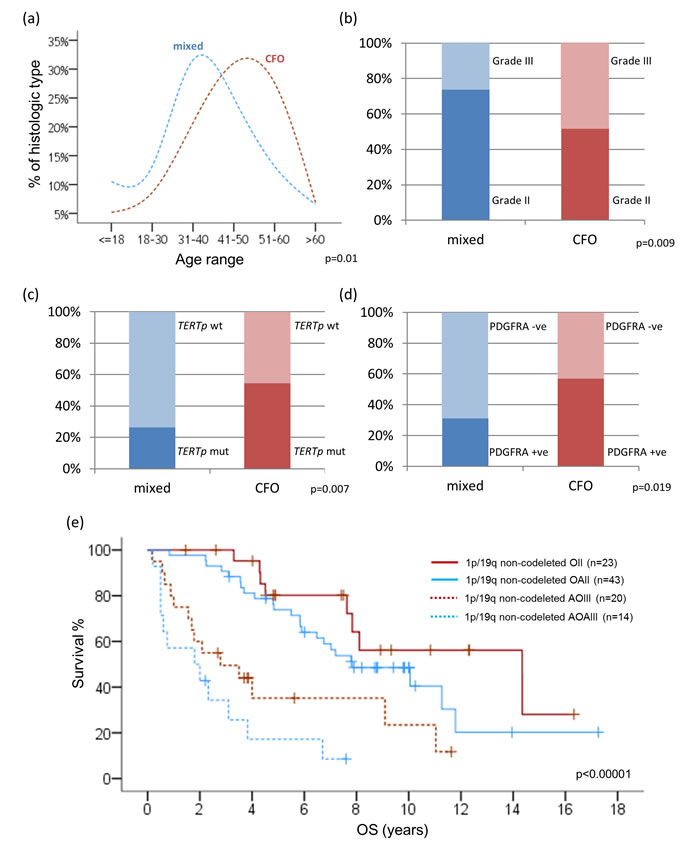 Figure 2: Correlations between clinicopathological factors and molecular variables among 1p/19q intact oligodendroglial tumors. Patients with classic oligodendroglial histology were significantly older than those with mixed oligoastrocytic histology (p = 0.01) a. Grade III histology was more common in oligodendrogliomas (48.3%) than oligoastrocytomas (26.3%) among 1p/19q non-codeleted tumors b. Classic oligodendroglial histology in a background of non-codeleted 1p/19q was associated with p mutation (p = 0.007) c. and positive PDGFRA expression (p = 0.019) d. Kaplan-Meier curves for overall survival (OS) of tumor histology in 1p/19q intact oligodendroglial tumors e. CFO, classic for oligodendroglial morphology; mixed, mixed oligoastrocytic histology; mut, mutant; wt, wild-type; -ve, negative; +ve, positive; OS, overall survival.