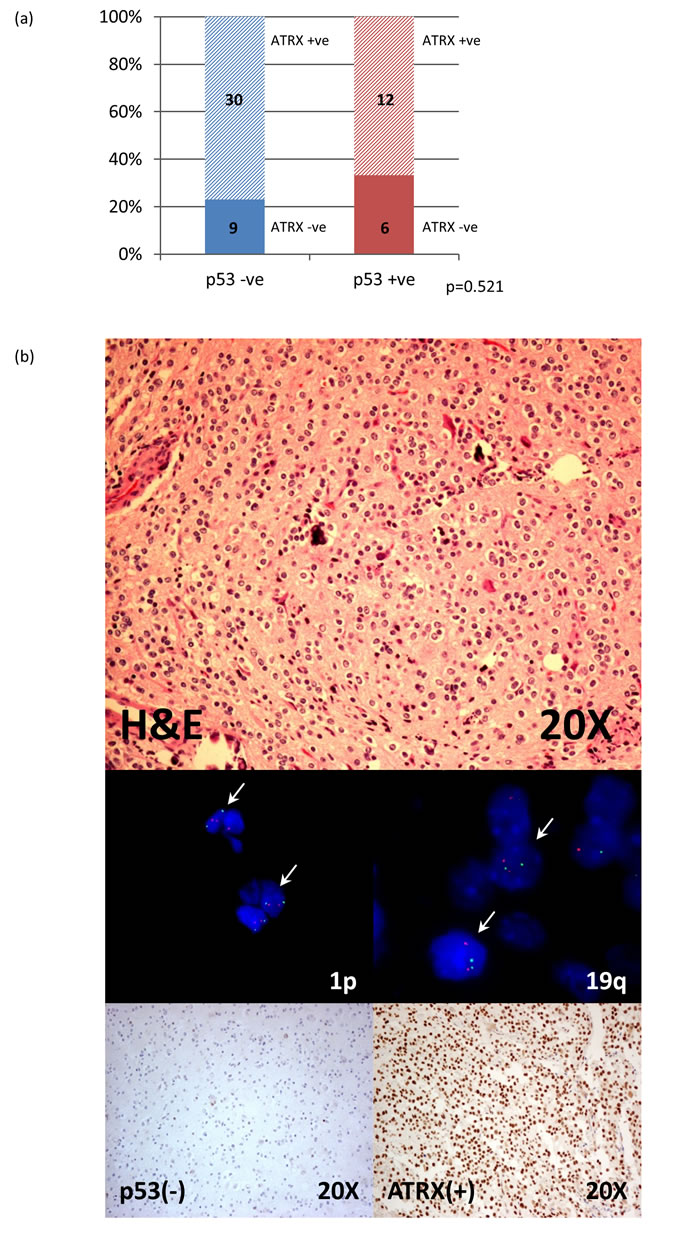 To further interrogate lineage of the oligodendrogliomas lacking 1p/19q codeletion, p53 and ATRX immunohistochemical expression were also evaluated. p53 immunohistochemistry positivity was detectable in only 30% of 1p/19q non-codeleted oligodendroglial tumors among 90 cases examined, including seven anaplastic oligodendrogliomas, 13 oligoastrocytomas and seven anaplastic oligoastrocytomas (Supplementary Figure S1c). Among 70 cases of 1p/19q non-codeleted gliomas examined for ATRX expression, internal positivity was detected in 61 cases and only 26.2% (16/61) of cases demonstrated ATRX loss. 83.3% (15/18) of oligodendrogliomas and 69.8% (30/43) of oligoastrocytomas showed ATRX positivity even in a background of intact 1p/19q (Supplementary Figure S1d). Co-evaluation of p53 and ATRX immunohistochemistry identified 52.6% (30/57) of 1p/19q non-codeleted oligodendroglial tumors lacking the important astrocytic markers (Figure 3).