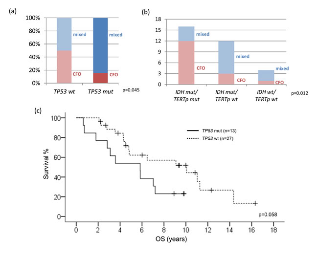 Figure 4: Correlations between TP53 mutational status and clinicopathological and molecular variables. Half of TP53 wild-type tumors showed classic oligodendroglial histology (p = 0.045) a. Mutations of IDH and TERTp co-occurred in 75% of oligodendrogliomas without 1p/19q codeletion and TP53 mutation (p = 0.012) b. Patients with Wild-type TP53 tend to have better survival (p = 0.058) c. CFO, classic for oligodendroglial morphology; mixed, mixed oligoastrocytic histology; mut, mutant; wt, wild-type; OS, overall survival.