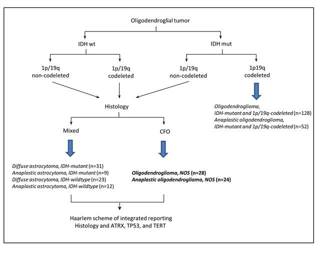 Figure 5: Overview of the sequential work-flow based on The 2016 WHO classification of CNS tumors and Haarlem scheme [20, 56]. mixed, mixed oligoastrocytic histology; CFO, classic for oligodendroglial morphology.