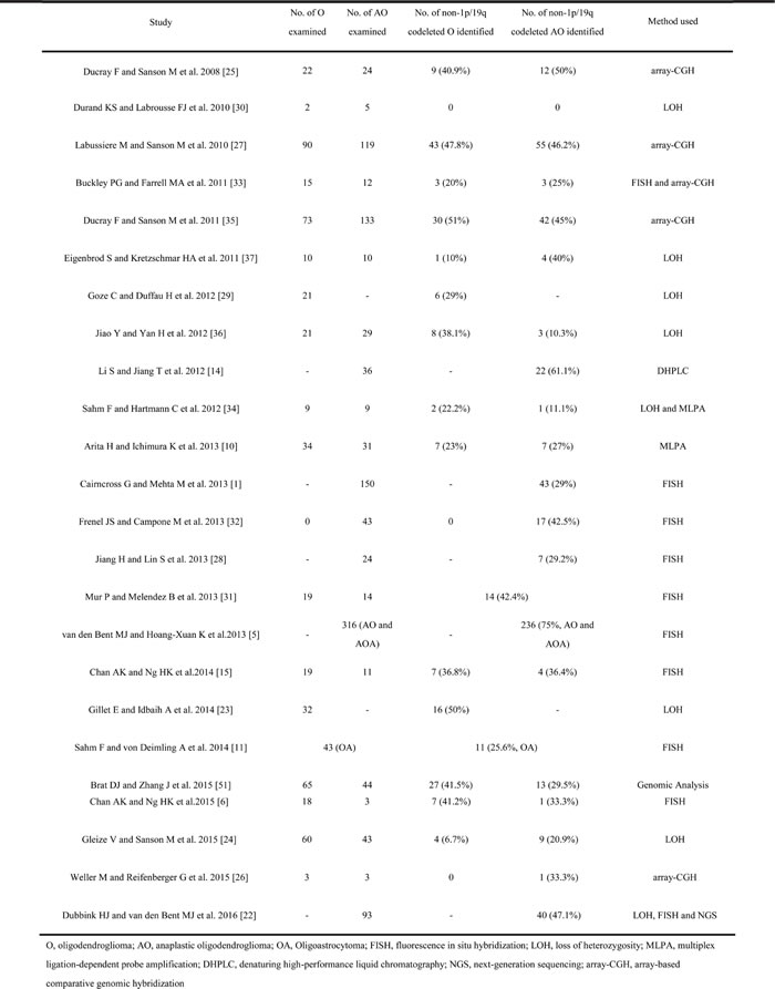 28. Jiang H, Ren X, Cui X, Wang J, Jia W, Zhou Z and Lin S. 1p/19q codeletion and IDH1/2 mutation identified a subtype of anaplastic oligoastrocytomas with prognosis as favorable as anaplastic oligodendrogliomas. Neuro-oncology. 2013; 15(6):775-782.