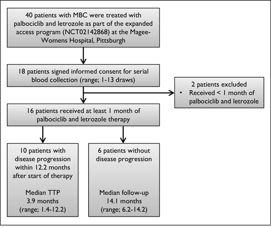 Figure 1: Flow diagram of patient selection. Flow chart indicates study population and inclusion criteria for patient selection. TTP represents time to progression.