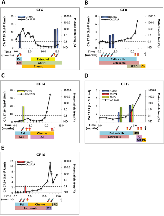 Figure 2: ESR1 mutant allele frequency in serial blood draws from positive cfDNA samples. Average mutant allele frequency ± SEM is indicated using data from at least three replicates (after subtraction of background noise). Dotted line representing the LLoD (0.1%) was used as cut-off. ND represents mutation not detected. A. patient CF6, B. patient CF8, C. patient CF14, D. patient CF15, and E. patient CF16.
