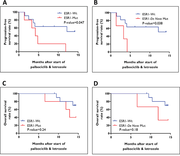 Figure 4: Survival curves for patients treated with palbociclib and letrozole. A-B. Progression-free survival (PFS), and C-D. overall survival (OS) for patients stratified based on ESR1 mutation status, ESR1-wildtype versus ESR1-mutant, and ESR1-wildtype versus ESR1-de novo mutant.