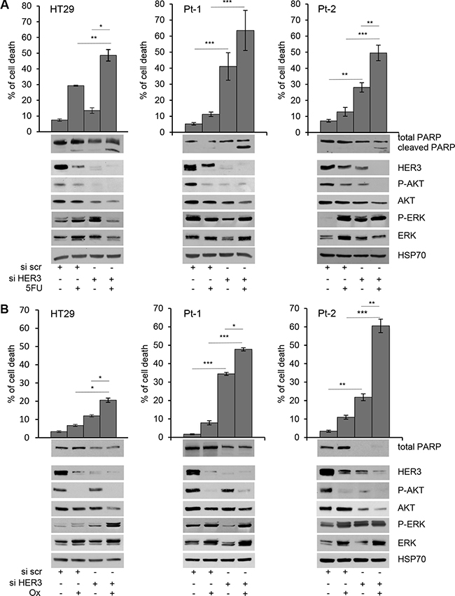 Figure 1: Depletion of HER3 expression induces apoptosis and sensitizes colon cancer cells to 5-FluoroUracil and Oxaliplatin. Cell viability of transiently transfected siscr and siHER3 HT29, Pt-1, and Pt-2 cells, treated or not with 5-FU (A) upper panel) and Ox (B) upper panel) for 48 hours, was evaluated by Trypan Blue exclusion. The percentage of cell death is presented as mean +/– standard deviation of three independent experiments. Total cell lysates from transiently transfected siscr and siHER3 HT29, Pt-1, and Pt-2 cells, treated or not with 5-FU (A, lower panel) and Ox (B, lower panel) were analyzed by immunoblot to evaluate the expression of HER3, total and p-AKT, total and p-ERK, and PARP. The anti-HSP70 antibody was used to validate equivalent amount of loaded proteins in each lane. The results are presented as mean +/– standard deviation of three independent experiments *p < 0.05, **p < 0.001, ***p < 0.0001.