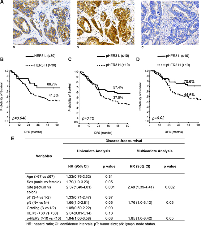 Figure 2: Total and p-HER3 expression correlates with disease-free survival in CRC specimens. (A) Representative CRC cases showing: (a) total HER3 positivity, (b) phospho-HER3 positivity on the consequential section, (c) negative HER3 expression. Scale bar 100 μm. Kaplan-Meier estimates DFS for HER3 (B) and pHER3 status (C) in 185 stage I–IV CRC patients. (D) Estimates of DFS for pHER3 status in the I–III stage CRC patients. P-values were calculated using the long-rank test. DFS = Disease-free Survival. L = Low expression, H = High expression. (E) Univariate and multivariate analyses performed in the 141 stage I–III patients.