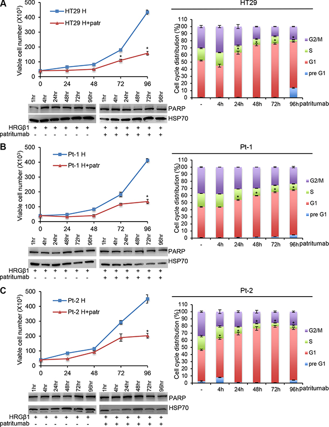 Figure 3: Patritumab administration inhibits cell proliferation and induces growth arrest in the G1 phase of the cell cycle. 5 × 104 cells of HT29 (A), Pt-1 (B), and Pt-2 (C) cell lines were seeded into six-well plates. HRG-β1-stimulated cells, patritumab-treated or untreated, were collected at the indicated times and counted in 0.2% trypan blue solution (left, upper panels). The cells incubated with 10 ng/ml HRG-β1 and 10 μg/ml patritumab antibody for the indicated times were lysed and analyzed by immunoblot to evaluate the expression of PARP. Anti-HSP70 antibody was used to validate equivalent amount of loaded proteins in each lane (left, lower panels). The same cells were stained in PBS containing propidium iodide and RNase-A overnight at 4°C. The DNA content of the cells was measured by fluorescence-activated cell sorting (FACS) (right panels). A total number of 1 × 104 cells for each sample were acquired. The results are presented as mean +/– standard deviation. *p < 0.05; **p < 0.001; ***p < 0.0001 compared to control.