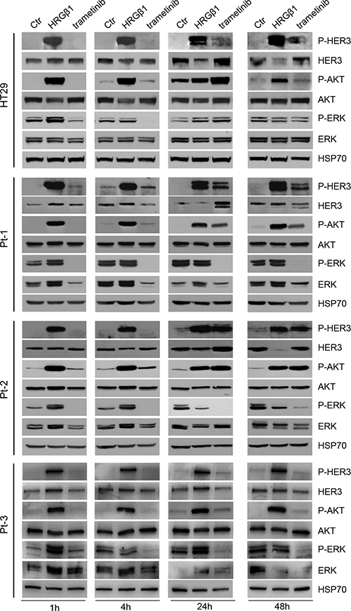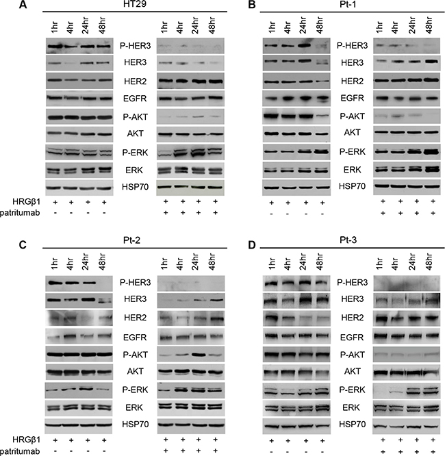 After an overnight of serum starvation, HT29, Pt-1 and Pt-2 cell lines were incubated with 10 ng/ml HRG-β1 and 10 μg/ml patritumab antibody for the indicated times.