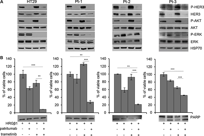 Figure 5: Trametinib administration induces the HER3-dependent activation of PI3K pathway. Total cell lysates from HT29, Pt-1, Pt-2, and Pt-3 cells incubated with 10 ng/ml HRG-β1 or treated with 5 nM trametinib, for the indicated times, were analyzed by immunoblot to evaluate the expression of total and p-HER3, total and p-AKT, total and p-ERK. The anti-HSP70 antibody was used to validate equivalent amount of loaded proteins in each lane.