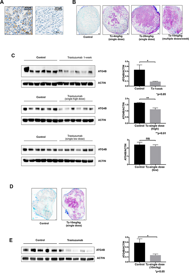 Figure 6: ATG4B levels correlate with HER2 status and trastuzumab treatment in vivo. A. Immunohistochemical images representing patient breast tumors positive and negative for ATG4B expression. B. Distribution of trastuzumab through breast cancer xenografts in a dose-dependent manner. Mice bearing BT-474 xenograft tumors received single 4, 10 or 20 mg/kg doses of trastuzumab for 8h or 10 mg/kg every 72h for one week, with tissues collected 24 h after last dose. Bound trastuzumab was labeled in tumor cryosections using fluorescently tagged antihuman secondary antibodies; representative sections are shown with trastuzumab (magenta), CD31 (dark blue), and perfusion dye, DioC7(3) (cyan). Scale bar, 150 μm. C. Trastuzumab treatment results in reduction of ATG4B protein expression in BT-474 tumor xenografts in a dose-dependent manner. ATG4B and actin protein levels in tumors from the previously described experiment (panel B) were assessed with western blot analysis. Bar plots demonstrate average ATG4B expression within each treatment group (mean±SEM) normalized to actin (used as internal control for protein loading); P values are based on the Student’s t-test. D. Distribution of trastuzumab in JIMT1 xenograft tumor collected 24 hour following treatment with a single dose of 10mg/kg trastuzumab. Bound trastuzumab was labeled in tumor cryosections using fluorescently tagged antihuman secondary antibodies; a representative section is shown with trastuzumab (magenta), CD31 (dark blue), and perfusion dye, DioC7(3) (cyan). Scale bar, 150 μm. E. Trastuzumab treatment results in reduction of ATG4B protein expression in JIMT1 tumor xenografts. ATG4B and actin protein levels in tumors were assessed with western blot analysis. Bar plots demonstrate average ATG4B expression within each treatment group (mean±SEM) normalized to actin (used as internal control for protein loading); P values are based on the Student’s t-test.
