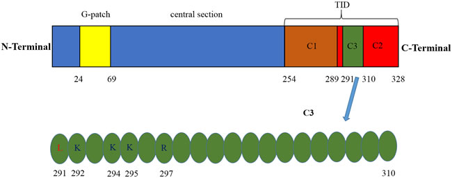 Figure 1: Identification of the main domain for the human PinX1. Top panel, G-patch domain is located at its N-terminal 46aa (24-69aa), TID domain is located at its C-terminal 74 aa (254-328 aa), C1 region of TID domain (254-289aa) specifically binds to Pin2/TRF1, C2 region of TID domain (29-328aa) contains a PinX1 nucleolus localization signal can associate with TERT, C3 region of TID domain (291-310aa) specifically recognized by TRFH domain of TRF1 via both hydrophobic as well as hydrophilic interactions. Bottom panel, sequence of C3 fragment. PinX1-L291 is critical for the hydrophobic interaction and PinX1-K292, PinX1-K294, PinX1-K295 and PinX1-R297 are critical for the hydrophilic interaction.