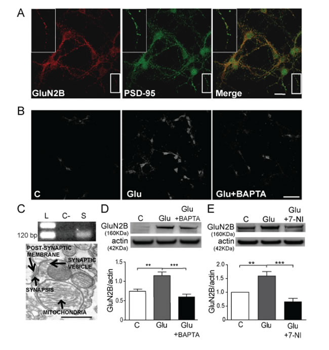Figure 1: Glutamate increases GluN2B expression through a mechanism that involves calcium and NO. A. Confocal immunofluorescence images of GluN2B (red) and PSD-95 (green) colocalization (merge) (Scale bar: 10 µm). B. GluN2B immunodetection in cultured mouse cortical neurons untreated (C: control) treated with 10 µM glutamate (Glu) for 1 h in the absence/presence of 10 µM BAPTA-AM (Glu+BAPTA) (Scale bar: 60µm). C. Agarose gel showing the cDNA of GluN2B subunit extracted from mouse cortical synaptosomes (L: ladder, C-: negative control without cDNA, S: cDNA from synaptosomes) and electron microscopy image of synaptosomes showing the active synaptic areas (Scale bar: 200nm). D. and E. WB from cortical mouse synaptosomes treated with 10 µM glutamate for 1 h in the absence and the presence of 10 µM BAPTA-AM, or 10 µM 7-NI and the respective quantification of GluN2B bands after correction by actin. Data are the mean ± SEM of 5 independent experiments. **p < 0.001 and **p < 0.0001 by one way ANOVA with Bonferroni’s post-test.