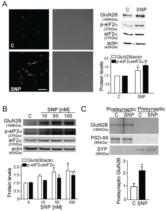Figure 2: NO induces GluN2B expression and eIF2α phosphorylation. A. GluN2B detection in cultured mouse cortical neurons treated with 100 nM SNP for 1 h by IF and WB (Scale bar: 60µm). The quantification of GluN2B and p-eIF2α are corrected respectively by actin and total eIF2α. Data are the mean ± SEM of 19 independent experiments. *p < 0.05, **p < 0.001 by Student t- test. B. WB from cortical mouse synaptosomes treated with 10, 50 and 100 nM SNP and band quantification after correction by actin and total eIF2α. Data are the mean ± SEM of 4 independent experiments. *p < 0.05 and **p < 0.001 by one-way ANOVA with Bonferroni’s post-test. C. GluN2B detection in postsynaptic and presynaptic membrane from mouse cortical neurons treated with 100 nM SNP for 1 h. Synaptophysin/p38 (SYP) and PSD-95 are used to confirm the accuracy of the subcellular fractionation procedure. The histogram corresponds to the average of relative GluN2B expression levels in the PSD fraction. Data are the mean ± SEM of 3 independent experiments. *p < 0.05 by Student t- test.