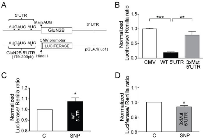 There are a group of proteins whose mRNA have several uAUGs in the ORF in the 5’UTR of the mRNA sequence, as previously reported for some proteins [18, 23-25], and it makes the translational control of these proteins completely different. Interestingly the mRNA of GluN2B has a 5’UTR expanding 179 nucleotides with three uAUGs (access number in NCBI: NM_000834). Therefore we studied if the 5’UTR sequence was able to repress the GluN2B expression in rest conditions and if the presence of the 3 upstream AUGs were responsible (Figure 4). We cloned the 5’UTR of GluN2B (WT 5’UTR) in a vector upstream of a reporter luciferase gene under the control of a CMV promoter and expressed in neuroblastoma cells. We also generated a mutant of the three uAUG (3xMut), exchanging A for U, and a control vector that just express the luciferase gene and the CMV promoter (CMV) (Figure 4A).