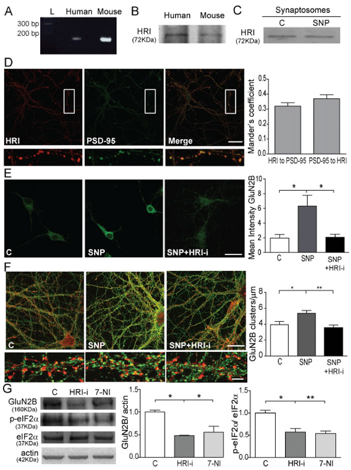 Figure 5: HRI kinase is involved in p-eIF2α and GluN2B translation. A. PCR image showing HRI cDNA from mRNA in human cortex and mouse cortical neurons. B. WB of HRI immunoprecipitated from human cortex and mouse cortical neurons. C. Representative WB showing HRI presence in synaptosomes from mouse cortex untreated or treated with 100 nM SNP for 1 h. D. Confocal images showing co-localization (merge) between HRI (red) and PSD-95 (green). Quantification of the co-localization performed by Mander’s coefficient analysis is shown (Scale bar: 10 µm). E. Confocal images showing GluN2B expression in control untreated neurons, treated with 100 nM SNP or treated with 100 nM SNP plus 1 µM HRI-i for 1 h. Quantification of the mean intensity of GluN2B is shown. Data are the mean ± SEM of 4 independent experiments. *p < 0.05 one-way ANOVA with Bonferroni’s post-test (Scale bar: 20 µM). F. Confocal images from DIV21 cultures showing GluN2B (green) and phalloidin staining of actin (red) (Scale bar: 10 µM). Higher magnification of dendrites in the lower panels (Scale bar 5 µm). Quantification of GluN2B clusters were normalized by µm. Data are the mean ± SEM of 3 independent experiments. *p < 0.05 **p < 0.001 one-way ANOVA with Bonferroni’s post-test. G. WB of synaptosomes from mice treated with DMSO, 50 mg/Kg HRI-i and 50 mg/Kg 7-NI. Quantification of data after correction for actin and total eIF2α is shown. Data are the mean ± SEM of 3 independent experiments. *p < 0.05, **p < 0.001 one-way ANOVA with Bonferroni’s post-test.