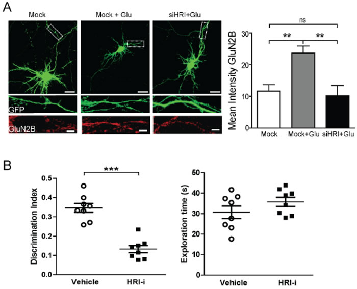 Figure 7: Functional effects of HRI ablation in cells and HRI inhibition in memory retrieval. A. Immunofluorescence study of GluN2B expression in primary cortical cultures transfected with eGFP, under basal conditions (left panel) or after glutamate (10 µM) stimulation (center and right panels). Representative images of cortical neurons transfected with eGFP (green channel) with HRI siRNA (siHRI, right panel) or without (Mock). The insets represent the dendritic processes showing the endogenous levels of GluN2B subunit (red channel) after the treatments. Scale bars: 20 µm (low magnification) and 5 µm (inset). Statistical analysis using a one-way ANOVA with Bonferroni’s post-test (**p < 0.01). B. Memory retrieval was impaired in mice treated with an HRI-i compared to vehicle. Discrimination index values were obtained in mice treated with the HRI-i 1 hour before the test session. Data are the mean ± SEM n = 8 mice per experimental group. ***p < 0.001 by Student t-test. No differences were observed in the total exploration times between the experimental groups.