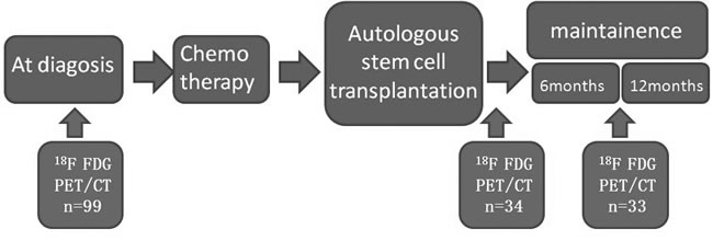 Ninety-eight newly-diagnosed MM patients who were given standardized treatment at the First Affiliated Hospital of Sun Yat-sen University between January 2010 to June 2014 prospectively received PET/CT scans and systemic bone X-rays at the onset of disease and during treatment (Figure 1). were enrolled in this study. Staging criteria for MM were based on IMWG international diagnostic criteria for multiple myeloma [16]. PET/CT scans were also performed on age- and gender-matched healthy volunteers (5 male and 10 female subjects, median age 48, age range 36-72) (Table 1). The baseline uptake range of 18F-FDG in normal bones was established from these 15 volunteers and the average uptake of bone marrow is 1.65 without lesions or fractures. Disease onset data of the 98 MM patients as well as the healthy volunteer are provided in Table 1. This study was approved by the Ethics Committee at the First Affiliated Hospital of Sun Yat-sen University, and all subjects provided written informed consent for this study.