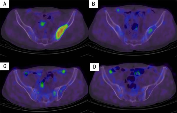 Figure 5: Decreased uptake of 18F-FDG in the iliac bone with continued treatment in an MM patient. A. On diagnosis. B. After PAD regimen. C. Six months after transplantation. D. Twelve months after transplantation.