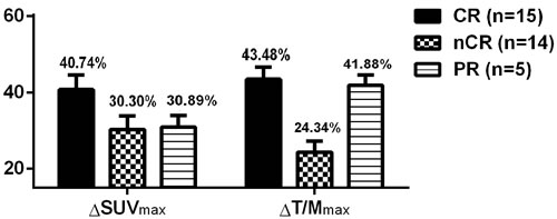 Figure 6: Comparison of the decrease in 18F-FDG uptake after chemotherapy in MM patients with different responses.