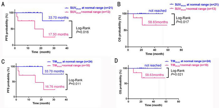 Figure 7: Survival analysis in MM patients who had normal or above-normal SUVmax (A: PFS, B: OS); or T/Mmax (C: PFS, D: OS) at end of PAD chemotherapy treatment.