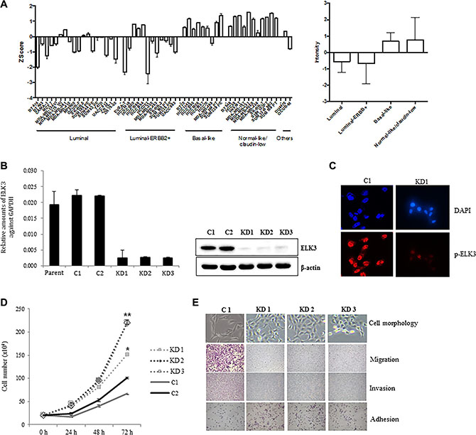 Figure 1: ELK3 regulates migration and invasion of MDA-MB-231 cells in vitro. (A) ELK3 expression in 51 breast cancer cell lines (18 luminal, 12 luminal-ERBB2+, nine basal-like, 11 normal-like/claudin-low, and one other) was analyzed. Data were obtained from public Micro Array databases (GEO: GSE41313; [19]) (left panel), and the average for each group was calculated (right panel). (B) MDA-MB-231 cells were transduced with a retrovirus expressing shRNA specific for ELK3, and three stable cell lines (KD1, KD2, and KD3) were selected following analysis of ELK3 expression. Control cell lines (C1 and C2) were generated by transduction of a control retrovirus. (C) Phospho-ELK3 localized in the nucleus of C1 and KD1 cells, as detected by immunocytochemical staining. (D) Proliferation of C1, C2, KD1, KD2, and KD3 cells was analyzed by counting cells at the indicated times after seeding. (E) Cell morphology was observed under a light microscope. Migration, invasion, and adhesion were analyzed as described in Materials and methods. Error bars represent the standard error from three independent experiments, each performed using triplicate samples. *P < 0.05 and **P < 0.01 (Student’s t-test).