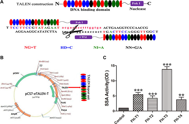 Figure 1: TALEN design and assembly. (A) shows the diagram of TALEN. (B) shows the assembly of TALEN. (C) shows the efficiency detect for the TALEN plasmids. The results shown that the FH-T3 has the most efficiency for knockout. n = 3. *P < 0.05, **P < 0.01, ***P < 0.001.