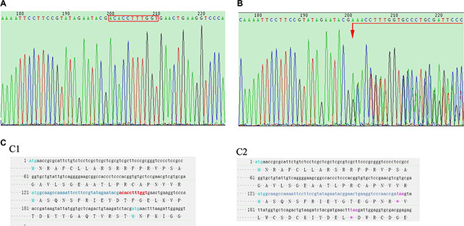 Figure 2: Rat tail DNA sequencing. (A) shows FH gene sequencing result of a WT rat, where the bases in the red rectangle are the TALEN targets. (B) shows FH sequencing result in a FH+/– KO rat, on which, chaos sequencing waives begin from the first TALEN targeted base (arrow head). (C) sequencing results of the FH exon 1 cDNA in the WT and FH+/– KO rats, where the red bases in C1 shows the TALEN targets in WT rat, and these bases are missing in the FH+/– KO rat on C2 with a terminator “taa” 20 bases after the TALEN targets, which results in a very short transcript.