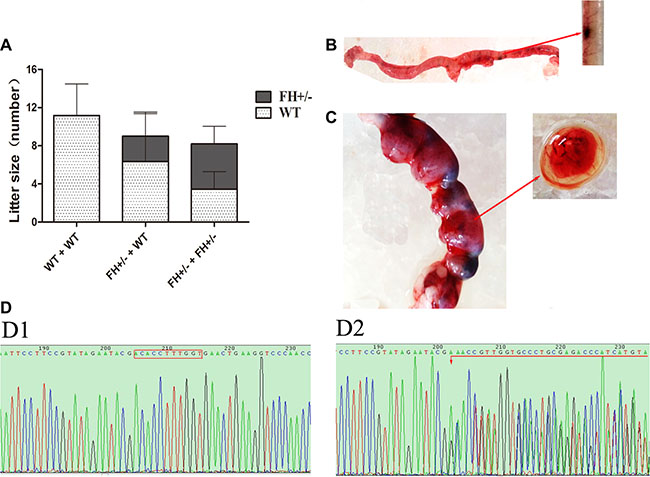 Figure 3: Litter size study and rat embryo sequencing. (A) shows the results of litter size observation in histograms. As shown on the histograms, the WT rat -WT rat mating groups show about 11 new born rats per litter, while the WT rat- FH+/–KO rat mating groups show 9 per litter with 29.6% decrease; and the FH+/– KO rat-FH+/– KO rat mating groups show 8 per litter with 58.0% decrease. (B) shows embryos from an E8.0 rat. (C) shows embryos from an E15.0 rat. D1 and D2 show the results of FH sequencing in WT and FH+/– KO embryos, respectively.