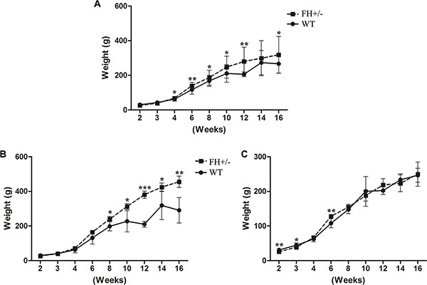 Figure 5: Body weight observation. (A), (B) and (C) show the general bodyweight curves for all the experimental rats, bodyweight curves for male rats and bodyweight curves for female rats, respectively. Compared to the WT rats, the male FH+/– KO rats show significantly higher bodyweights. * means P < 0.05, ** means P < 0.01, ***means P < 0.001. WT: n = 16, male = 7, female = 9; FH+/–: n = 14, male = 6, female = 8.