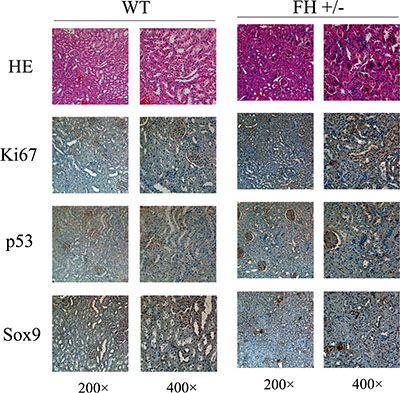 Figure 7: Histological and immunohistochemical results of rat kidney. Histological evaluation of the haematoxylin and eosin (HE) stained slides shows variable foci of tubular epithelial cells around glomeruli with abnormal structure and the cell nuclei are prominently bigger with thicker chromatin. These abnormal tubular epithelial cells in the FH+/– KO rat kidney are more positive for the expression of Ki67, p53 and Sox9.