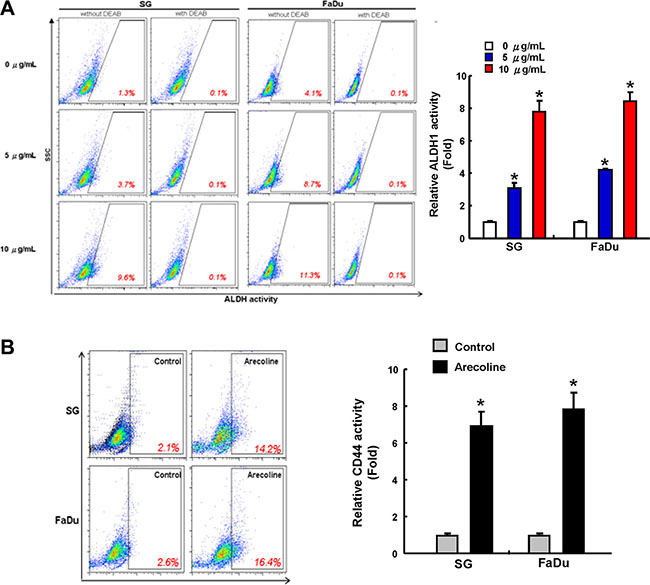 Figure 1: Increase of ALDH1 and CD44 activity in oral epithelial cells with long-term arecoline exposure. The expression of ALDH1 activity (A) and CD44 positivity (B) of control and long-term arecoline exposed oral epithelial cells (SG and FaDu) was determined by flow cytometry analysis. Data shown here are the mean ± SD of three independent experiments. *p < 0.05 vs. Control.