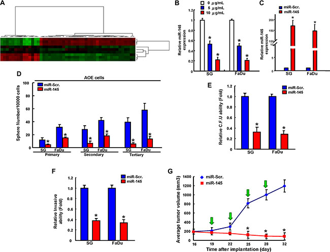 Figure 5: miR-145 effectively reverses long-term arecoline treatment-induced cancer stemness in vitro and in vivo. (A) The heat maps of control and long-term arecoline-treated oral epithelial cells were subjected to miRNA microarray and bioinformatics analysis. A significant decrease in miR-145 expression is found in long-term arecoline-treated oral epithelial cells. qRT-PCR analysis showing miR-145 in long-term arecoline exposed OE cells (B) and theses cells were transfected with miR-145 overexpression vector (C). These miR-145-transfected long-term arecoline exposed OE subclone cells were then assigned for the sphere formation assay (D), colony-forming assay (E), invasion assay (F), and xenografic tumorigenesis in nude mice with IVIS imaging system (G). Data shown here are the mean ± SD of three independent experiments. *p < 0.05 vs. Control.