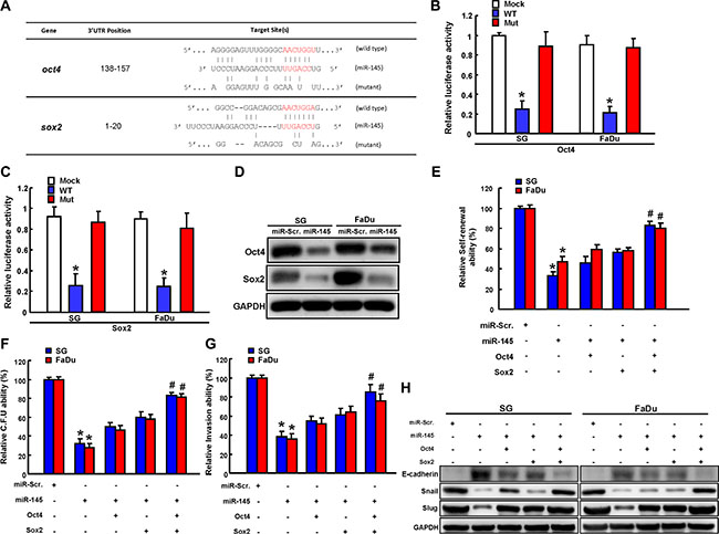 Subsequently, we illustrate complementarity between the 3′UTR regions of Oct4 and Sox2 and miR-145. To pinpoint the miR-145 target sequences in the 3’UTRs of Oct4 and Sox2, reporter plasmids which contained either full-length or mutated forms of the 3′UTR region of Oct4 and Sox2 were constructed (Figure 6A). Luciferase reporter assays demonstrated that miR-145 reduced the luciferase activity of reporter plasmids containing wild type Oct4 (Figure 6B) and Sox2 (Figure 6C) 3′UTR. However, when the potential Oct4 and Sox2 targeting site was mutated, miR-145 no longer inhibited the luciferase activity (Figure 6B and Figure 6C). Protein levels of Oct4 and Sox2 were also decreased in the miR-145-overexpressing AOE cells (Figure 6D). The functional involvement of Oct4 and Sox2 in miR-145-mediated cancer stemness and EMT in AOE cells was further clarified through Oc4/Sox2 overexpression. miR-145 suppressed spheres-forming capability in AOE cells, which would be rescued by Oc4/Sox2 over-expression (Figure 6E). Furthermore, Oc4/Sox2 over-expression in miR-145-overexpressing AOE cells partially counteracted clonogenicity (Figure 6F) and invasion phenomenons (Figure 6G). We demonstrated that miR-145 down-regulated a pattern of mesenchymal-like transcription factor (Snail and Slug) and up-regulated epithelial protein (E-cadherin) in AOE cells, were reversed by Oct4/Sox2 overexpression (Figure 6H).
