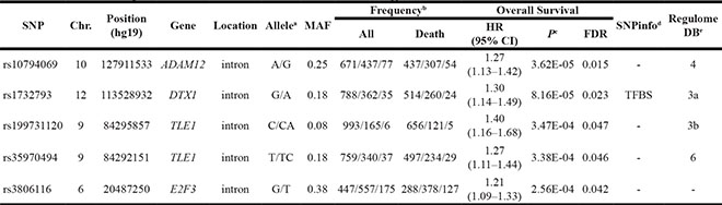 Then, we performed survival analyses with different genetic models for each tagSNP using univariate and multivariate Cox regression analysis methods. As shown in Table 1, we found that under an additive genetic model, ADAM12 rs10794069 G, DTX1 rs1732793 A, TLE1 rs199731120 CA, TLE1 rs35970494 TC and E2F3 rs3806116 T variant alleles were associated with a poor NSCLC OS, with a variant-allele attributed hazard ratio (HR) of 1.27 [95% Confidence interval (95% CI) = 1.13–1.42, P = 3.62E-05], 1.30 (95% CI = 1.14–1.49, P = 8.16E-05), 1.40 (95% CI = 1.16–1.68, P = 3.47E-04), 1.27 (95% CI = 1.11–1.44, P = 3.38E-04), and 1.21 (95% CI = 1.09–1.33, P = 2.56E-04), respectively.