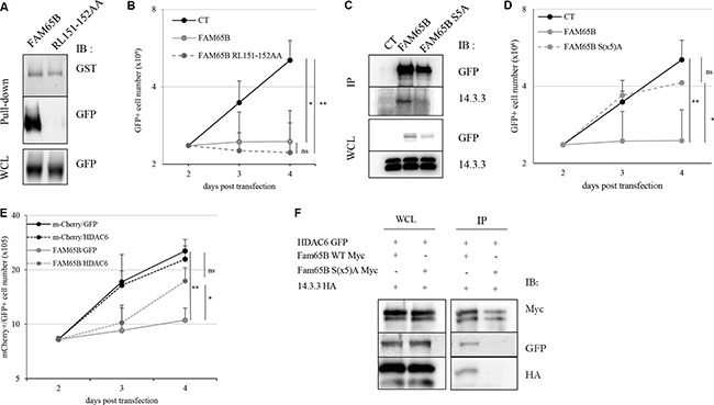 Figure 3: The anti-proliferative property of FAM65B results from its capacity to interfere with HDAC6 and 14.3.3. (A) Lysates from HEK293T cells transfected with FAM65B-GFP or FAM65B RL151-152AA-GFP mutant were subjected to a pull-down assay using beads bearing GST-RhoA. (B) The proliferation of transfected Jurkat cells with GFP alone (Control: CT) and wild type or mutant RL151-152AA forms of FAM65B expression vectors was measured by daily counting the number of viable cells. Results are shown as means ± SD of at least three individual experiments. (C) HEK293T cells were transfected with pEF-Myc vector expressing either no protein (Control: CT), FAM65B or its mutant S(x5)A form fused to GFP. Whole cell lysates (WCL) and anti-Myc immunoprecipitates were analyzed by immunoblotting. (D) The proliferation of transfected Jurkat cells with either GFP alone (Control: CT), wild type or mutant S(x5)A of FAM65B expression vectors was measured by counting daily the number of viable cells. Results are shown as means ± SD of at least three individual experiments. (E) The proliferation of Jurkat cells co-transfected with mCherry or FAM65B-mCherry and GFP or HDAC6-GFP was measured by counting the number of viable cells every day. Results are shown as means ± SD of at least three individual experiments. (F) HEK293T cells were co-transfected with HDAC6-GFP, 14.3.3-HA and pEF-Myc vector expressing either FAM65B or its mutant S(x5)A form. Whole cell lysates and anti-Myc immunoprecipitates were analyzed by immunoblotting.
